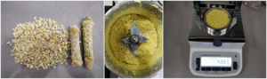 - 將玉米一粒粒掰開(kāi),放入攪拌機(jī)中進(jìn)行攪拌,充分?jǐn)嚢璩捎衩酌婧螅脤?shí)驗(yàn)勺取365g玉米面均勻鋪在樣品盤上,設(shè)置好合適的溫度后蓋下上蓋,按下“START”鍵開(kāi)始測(cè)試;蜂鳴兩聲后,儀器自動(dòng)停機(jī),測(cè)試結(jié)束,可在液晶顯示屏查看測(cè)試后玉米面的水含量為47.02%;