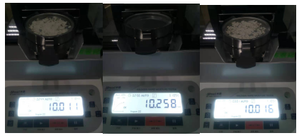 4.復(fù)位儀器,待儀器冷卻至40℃以下后,再取6.053克的氟化鈣礦粉(A3樣品)均勻鋪在樣品盤上,重復(fù)上述測試步驟;測試結(jié)束后得出第二組數(shù)據(jù),顯示樣品的水分含量為10.260%;