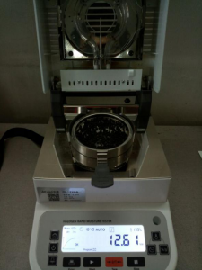 - 測(cè)試種子顆粒1:為了使測(cè)試過(guò)程中種子水分儀將種子烘干烘透,我們將種子分散開來(lái),以便溫度能滲透進(jìn)種子內(nèi)部。取5克種子顆粒撒于不銹鋼托盤中,用鑷子將種子顆粒平鋪均勻,為避免種子烘烤后變焦,我們將溫度設(shè)置在135℃,按“START”鍵開始測(cè)試,18分49秒后檢測(cè)結(jié)束,檢測(cè)數(shù)據(jù)顯示12.61%;