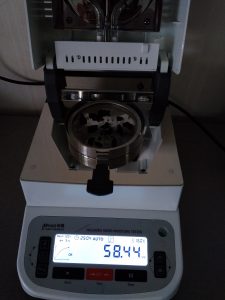 為了得到更精確穩(wěn)定的數據結梅,在進行第二次測試過程前先等待話梅干水分儀降溫,待儀器本身溫度降至40度以下時,同樣取3克話梅干碎于不銹鋼托盤中,將話梅干碎平鋪均勻,這次我們把溫度設定在160℃,按“START”鍵開始測試,30分08秒后檢測結束,檢測數據顯示58.82%;