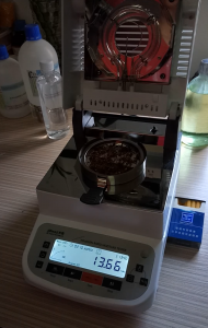 - 為了得到更精確穩(wěn)定的數(shù)據(jù)結(jié)果,在進(jìn)行第二次測試過程前先等待煙絲水分儀降溫,待儀器本身溫度降至40度以下時(shí),同樣取6克煙絲細(xì)條于不銹鋼托盤中,將煙絲細(xì)條平鋪均勻,這次我們把溫度設(shè)定在135℃,按“START”鍵開始測試,2分10秒后檢測結(jié)束,檢測數(shù)據(jù)顯示13.66%;