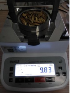 - 測(cè)試甘草:為了使測(cè)試過(guò)程中甘草水分儀將甘草烘干烘透,我們將甘草分散開(kāi)來(lái),以便溫度能滲透進(jìn)甘草內(nèi)部。取6克多甘草平鋪不銹鋼托盤中,用鑷子將甘草平鋪均勻,我們將溫度設(shè)置在105℃,按“START”鍵開(kāi)始測(cè)試,21分46秒后檢測(cè)結(jié)束,檢測(cè)數(shù)據(jù)顯示9.90%;