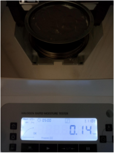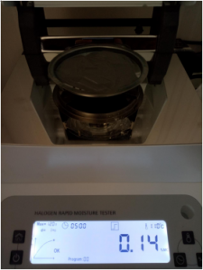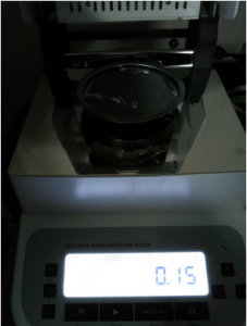 第一次,因樣品3屬金屬粉末,密度較大,取10克樣品3#粉末,置于不銹鋼托盤中,用鑷子將金屬粉末平鋪均勻,溫度設(shè)置110℃用儀器進(jìn)行加熱,定時(shí)5分鐘后檢測(cè)結(jié)束,檢測(cè)數(shù)據(jù)顯示0.15%;