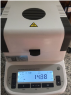 測(cè)試樣品2:為了檢測(cè)儀器的精確性,待儀器溫度降至50℃以下時(shí)進(jìn)行第二次測(cè)試,用實(shí)驗(yàn)勺提取5.5克飼料,置于不銹鋼托盤中,用實(shí)驗(yàn)藥勺將飼料平鋪均勻,溫度設(shè)置135℃用儀器進(jìn)行加熱,約15分鐘后檢測(cè)結(jié)束,檢測(cè)數(shù)據(jù)顯示14.88%;