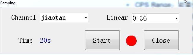 首先選中需要標(biāo)定的通道和線性。如上圖4.3所示:通道為選擇jiaotan(根據(jù)現(xiàn)場(chǎng)可以選擇新建的通道)?;然后選擇線性為:0-36(根據(jù)實(shí)際情況選擇);點(diǎn)Start按鈕,開(kāi)始啟動(dòng)取樣。啟動(dòng)后指示燈變?yōu)榫G色,Time 為采樣倒計(jì)時(shí),當(dāng)此數(shù)據(jù)為0時(shí)表示取樣完成。最后點(diǎn)Close關(guān)閉窗體按鈕完成取樣。